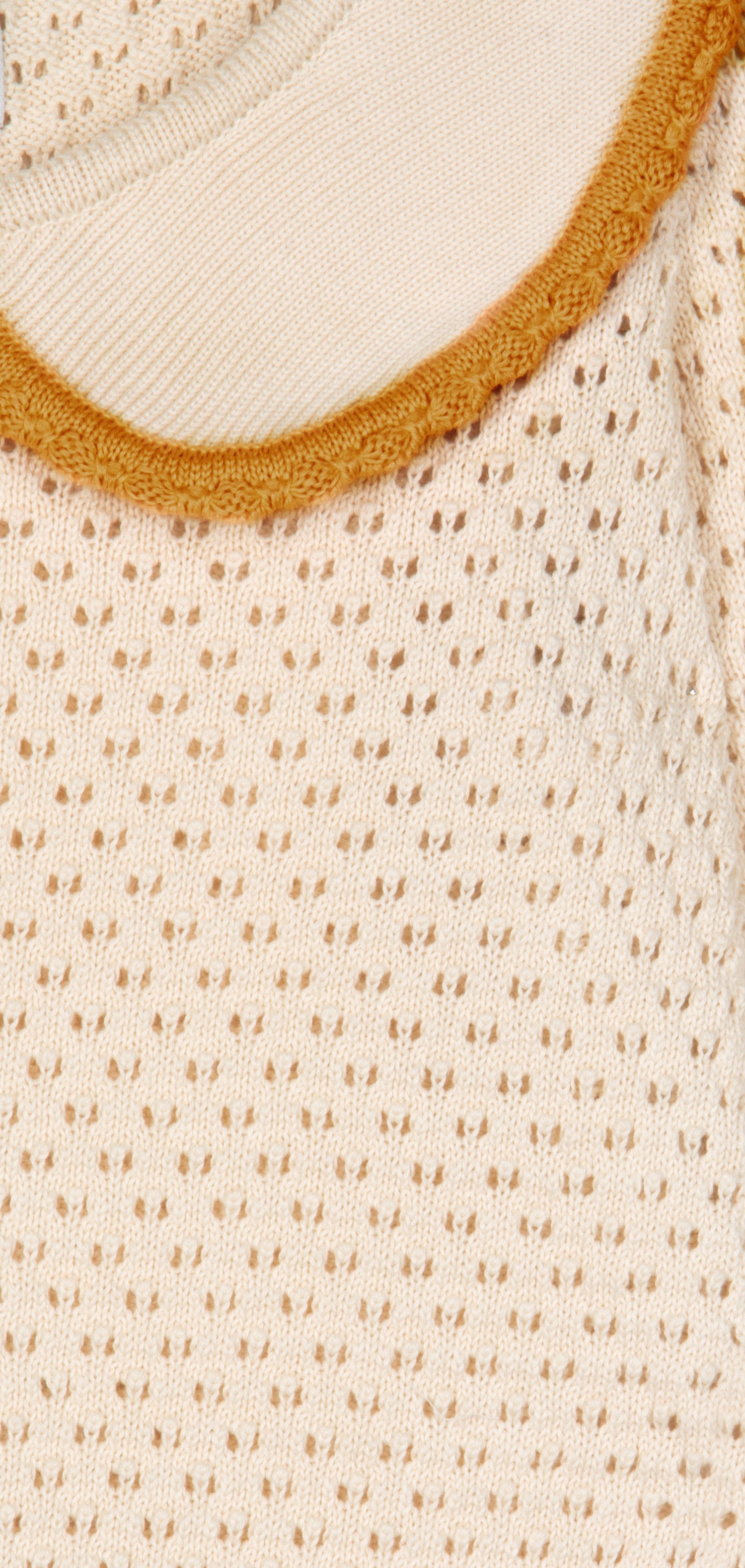 - Round collar- Scalloped trim- Short sleeves- Rib trim