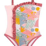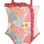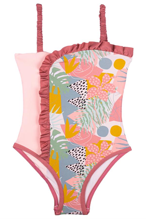 Eco-sustainable lycra swimsuit with ruffle detail around. Made with ecological yarn and protection factor upf50+. Contrast lining. Made in Spain.