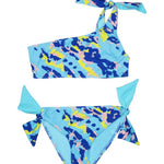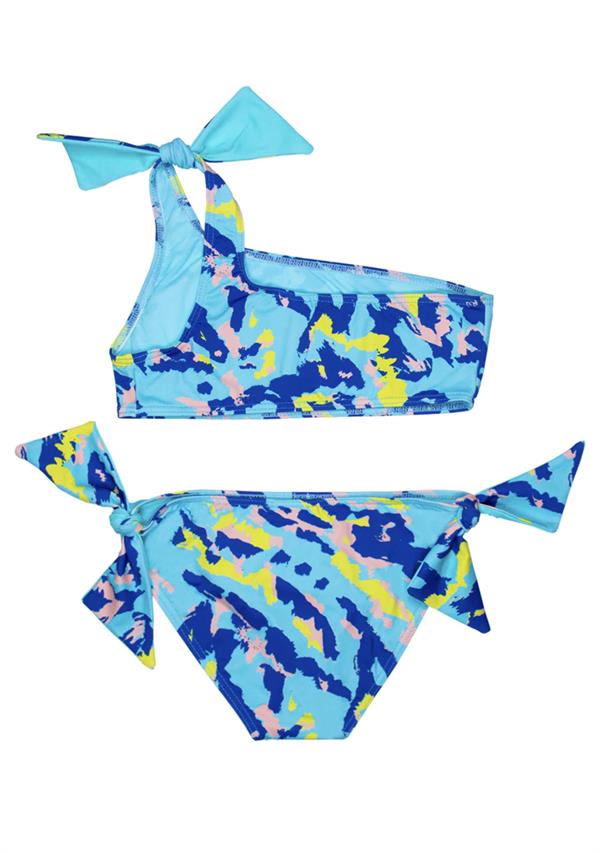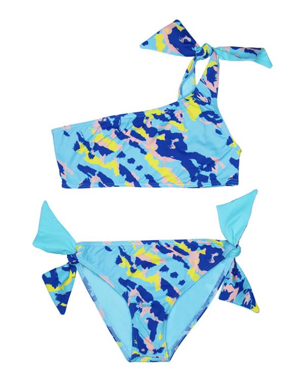 High-waisted eco bikini from our Teen collection, super flattering, asymmetrical cut and knot detail on both pieces. Fully lined with eco-sustainable lining. Made with ecological yarn and protection factor Upf50+. Made in Spain.