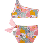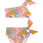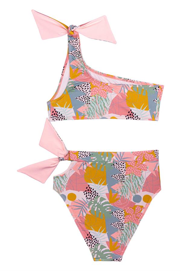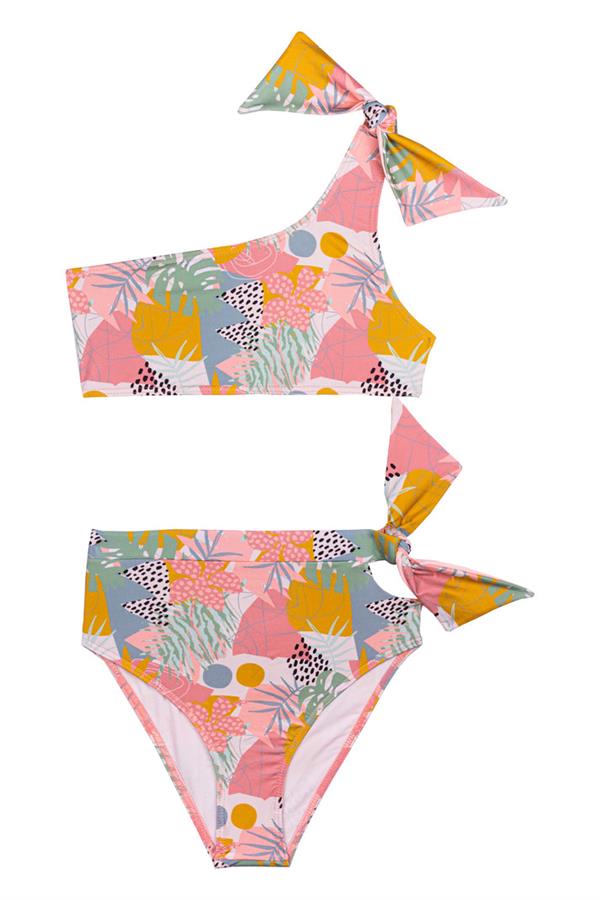High-waisted eco bikini from our Teen collection, super flattering, asymmetrical cut and knot detail on both pieces. Fully lined with eco-sustainable lining. Made with ecological yarn and protection factor Upf50+. Made in Spain.